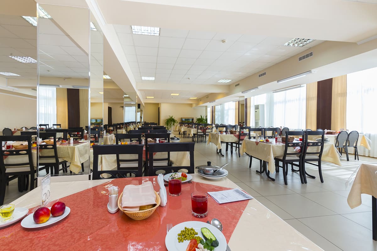 Предлагается трёхразовое питание по диетическим меню с элементами «шведского стола». Меню включает разнообразные диеты (1Б, 1, 2, 3, 4, 5, 5П, 6, 8, 9, 14, 15 и другие), которые соответствуют принципам сбалансированного питания. Для тех, кто переходит от специального питания к обычному, предусмотрена «переходная» диета. Для детей предусмотрены полдники с кондитерскими изделиями и фруктами.