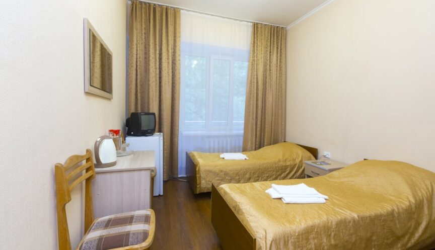 Однокомнатный номер площадью 11 квадратных метров. Из номера открывается вид на город и гору Железная. В номере есть вешалка, зеркало, две односпальные кровати с прикроватными тумбочками, стол, стулья и шкаф. Оснащён телевизором и холодильником. Санузел с душем, предоставляются туалетные принадлежности и фен.