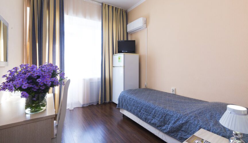 Однокомнатный номер с видом на город. Площадь номера — 9 кв. м. В номере есть односпальная кровать, стол, стул, вешалка, шкаф, прикроватная тумбочка, зеркало. Среди оборудования — телевизор и холодильник. Санузел оснащён душем (или ванной) и всеми необходимыми туалетными принадлежностями, включая фен.
